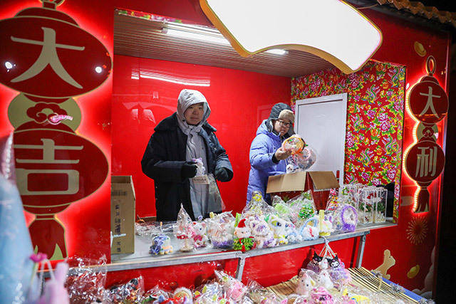 赏灯之余,舌尖盛宴与市井温情更添暖意。舞台两侧,20辆移动街景车整齐排列,5个免费开放的取暖泡泡屋暖意融融,肉夹馍、锅包肉等20余种本地特色美食香气扑鼻,让游客在严寒冬日里既能大快朵颐,又能感受贴心暖意。桥洞南侧的年货大集更是年味爆棚,冻梨、冻柿子带着东北冬日独有的清甜,咬一口冰爽多汁;红彤彤的糖葫芦酸甜开胃,晶莹糖壳裹着饱满果肉;春联、灯笼、中国结、剪纸等年俗好物琳琅满目,坚果礼盒、腊肉腊肠等年礼一应俱全,真正实现“一站式购齐年货”。“没想到年货这么全,在暖乎乎的泡泡屋里吃完美食,再逛集市挑年货,科右前旗的冬天又暖又有烟火气!”游客吕婷的由衷赞叹,是对这场冬日盛会的最佳褒奖。