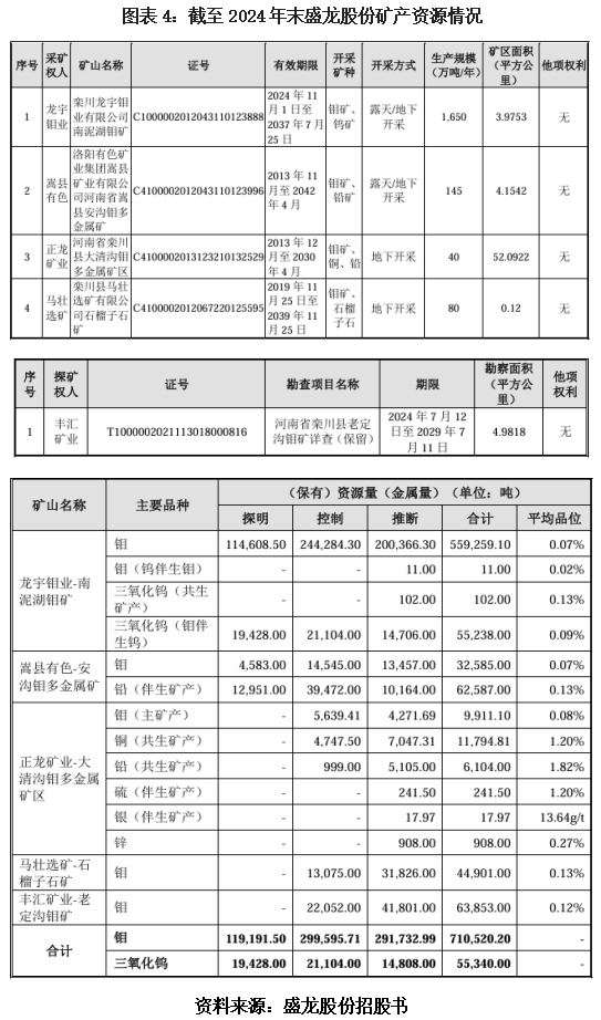 从储量上看,招股书显示,截至2024年末,盛龙股份保有钼金属量71.05万吨,依据自然资源部公布的《2024年中国自然资源公报》,全国钼资源储量为780.56万吨,据此计算,盛龙股份钼保有量约占全国钼资源储量的9.10%。