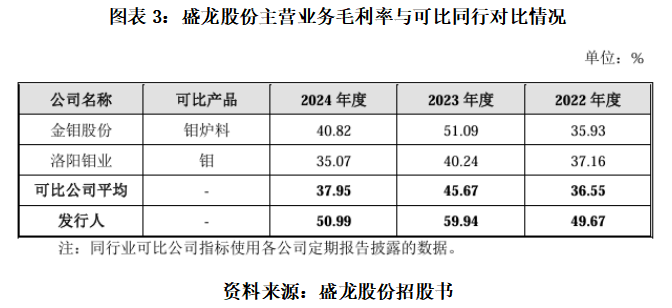 时代商业研究院注意到,2022—2024年(下称“报告期”),由于供不应求,钼价大涨,盛龙股份实现快速增长,且毛利率表现优于可比同行。