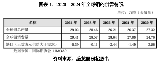 招股书显示,从产量上看,根据美国地质调查局(USGS)数据,2024年我国钼金属产量预计为11.00万吨,而盛龙股份钼金属产量为1.06万吨,占我国钼金属产量的9.64%,是我国重要的钼供应商之一。