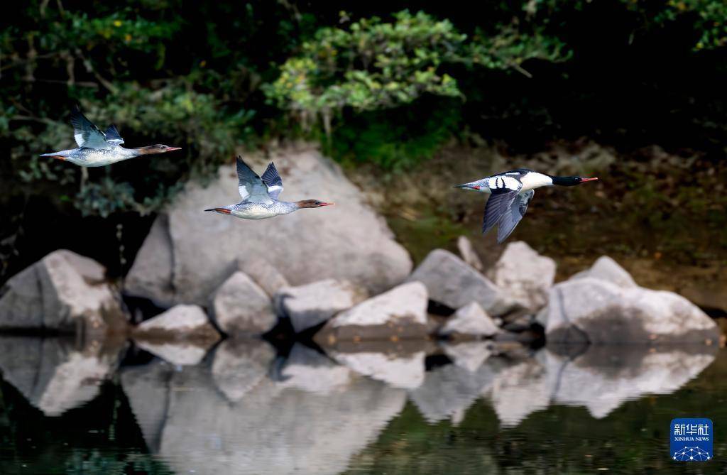 12月20日,中华秋沙鸭从大樟溪水面上空结伴飞行。